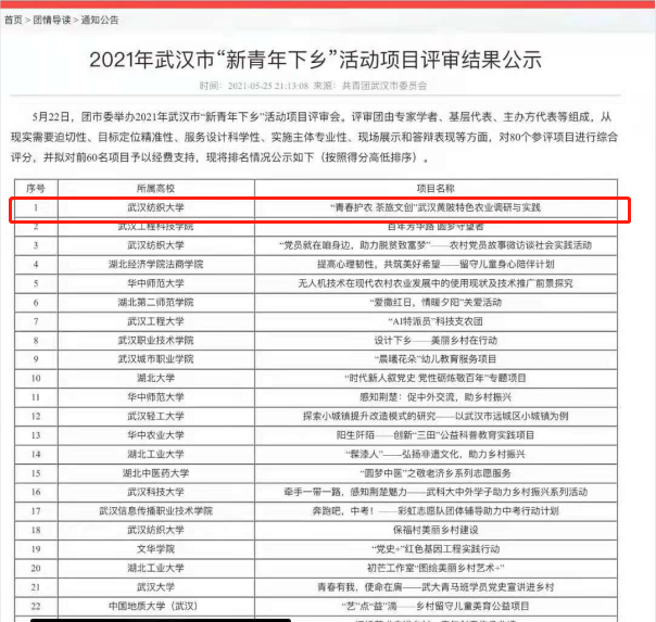 5月22日,共青团武汉市委举办了2021年武汉市“新青年下乡”活动项目评审会,由专家学者、基层代表、主办方代表等组成的评审团,从现实需要迫切性、目标定位精准性、服务设计科学性、现场展示和答辩等方面,对80个参评项目进行综合评分。最终,由我校新葡的京集团8814“青春护农”实践队申报的项目《“青春护农 茶旅文创”武汉黄陂特色农业调研与实践》从80个参评项目中脱颖而出,以第一名的优异成绩成功立项。