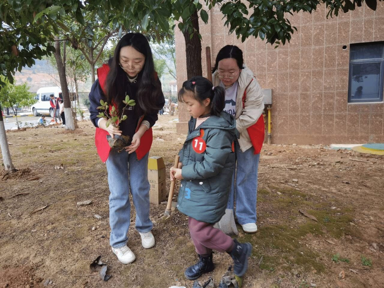 在种树环节,志愿者与亲子家庭并肩协作。大家齐心挥锹铲土、扶苗填坑、提水浇灌,每一个步骤都认真细致。孩子们亲手种下小树苗,许下守护树苗成长的承诺,不仅给予小青苗归属,更赋予自身责任。树苗如同孩子,只要遵其本性,悉心浇灌和呵护,终会参天,也终会成荫。活动的意义便在无形中得到了升华。