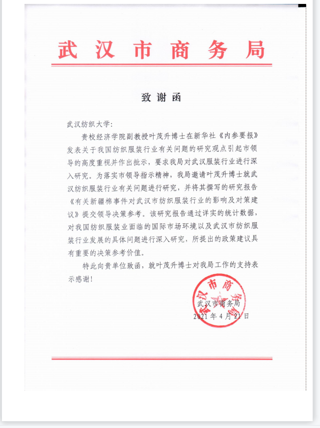4月21日,武汉市商务局向我校发来致谢函,对我校新葡的京集团8814叶茂升副教授为服务武汉市纺织服装行业发展提供的智力支持表示充分肯定与诚挚感谢。