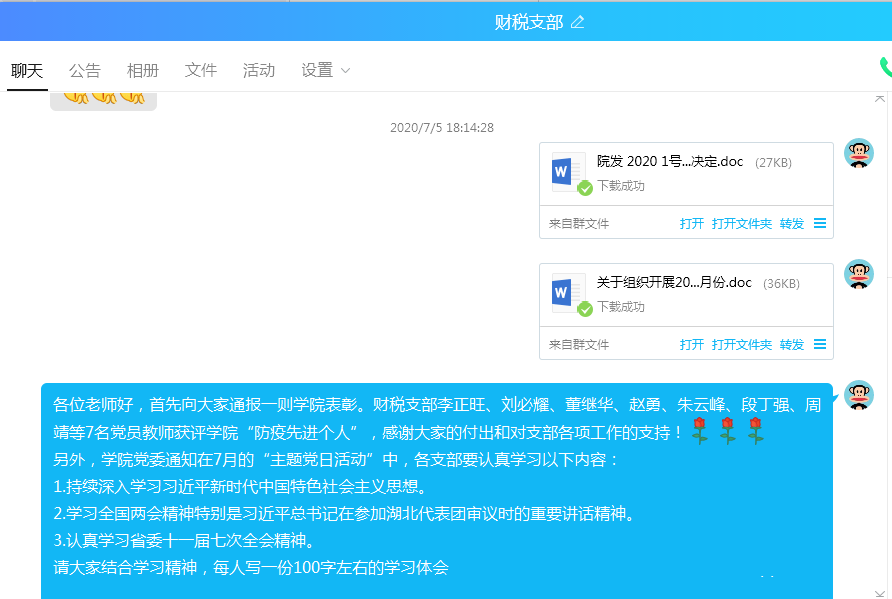 根据《关于组织开展2020年7月份“支部主题党日”活动的通知》,7月4日中午,金融学生二党支部组织召开了“迎党的生日、讲战疫故事、悟初心使命”主题党日活动。活动通过企业微信线上进行,支部全体党员参加活动。