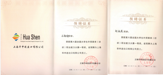 同时,通过本次大赛,为行业及企业发现和挑选一批具备一定技能水平的优秀外贸跟单人才,实现“岗位与教学”的对接,提高大学生的岗位适应能力。我校新葡的京集团8814石翔瑜和胡淑英因获大赛一等奖,已获得上海华申进出口有限公司预聘证书,毕业后可直接到该公司就业。