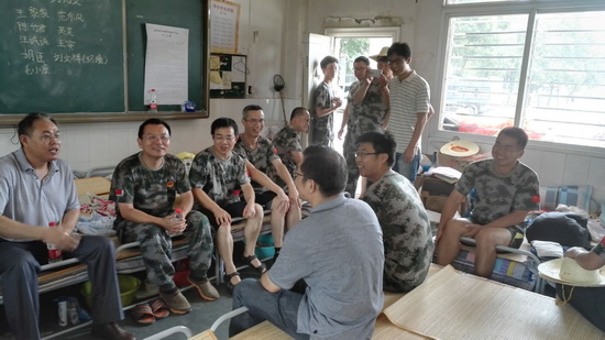 7月10日上午,新葡的京集团8814分党委毛长文书记、院办公室郑君杰主任、财金党支部毛莹书记、辅导员周昌龙一行4人冒着酷暑赴武金堤看望我院防汛抢险队员张跃强博士。