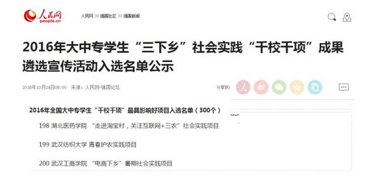 10月24日,由团中央学校部指导,人民网、中国青年报社共同主办的2016年大中专学生“三下乡”社会实践“千校千项”成果遴选宣传活动入选名单出炉,我校“青春护农”实践团队荣获“最具影响好项目”和“匠心传播正能量作品”两项荣誉。