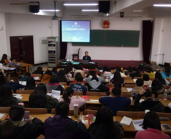 报告中,高部长从文化反思热兴起的原因入手,阐述了文化软实力之“义”,全面分析了影响国家文化软实力提升的因素,他认为,我国思想价值观念的感召力尚需在全球思想激荡的现实中进一步增强;话语体系构建相对滞后于内涵丰富的中国道路实践;文化辐射力影响力有待在全球文化竞争中进一步提高;在国际传播格局中我国仍处于弱势地位;个别公民文明素养欠缺和逐利败德行为削弱了国家软实力的微观基础。高部长强调,要提升国家文化软实力需从提升社会主义价值理念的感召力、构建中国风格话语体系、提高中国文化的辐射力、加强国际传播能力建设、加强公民道德教育及营造良好舆论环境等几个方面努力,积极引导学员们树立文化自信。