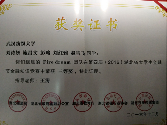 近日,由湖北省银监局、省政府金融办、省教育厅、省银行业协会和湖北日报传媒集团共同主办的第四届(2016)湖北省大学生金融节暨银行业金融知识宣传服务月活动圆满落幕。全省20余家银行机构代表、数十所高校师生代表出席闭幕式。在当天举办的金融知识竞赛总决赛中,我校新葡的京集团8814王涛老师指导的Fire dream代表队获团体三等奖。