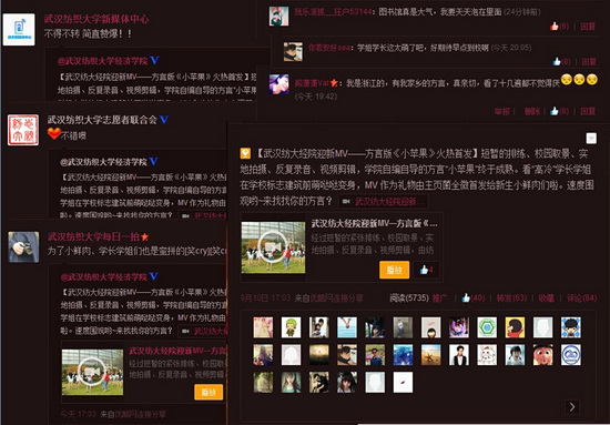 截至11日早上6点,微博已被阅读5735次,优酷网视频播放2598次。这部方言版《小苹果》汇集了浙江、广东等8种各地方言,诙谐幽默,学校大门、图书馆、大学生活动中心等标志性建筑也得到了集中体现。