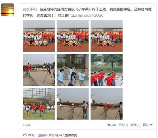 正值开学季,各大院校迎新亮点频出,新葡的京集团8814也不例外,一支活泼幽默接地气的方言版《小苹果》在优酷网、学院官方微博火热上线后,引来众多新生追捧。