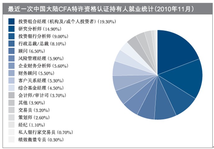 CFA考试被誉为“全球金融第一考”,其证书是全球投资领域通行证。全球的雇主和传媒都将CFA特许资格认证视为卓越的专业标准,凭着如此广泛的认同,CFA特许资格认证持有人在国际职场上享有明显的竞争优势。CFA特许资格认证持有人通常就职于投资公司、互惠基金公司、证券公司、投资银行等,或成为私人财富经理。作为紧缺人才,全球拥有CFA认证的仅10万多人,因此CFA有着令人羡慕的高收入。