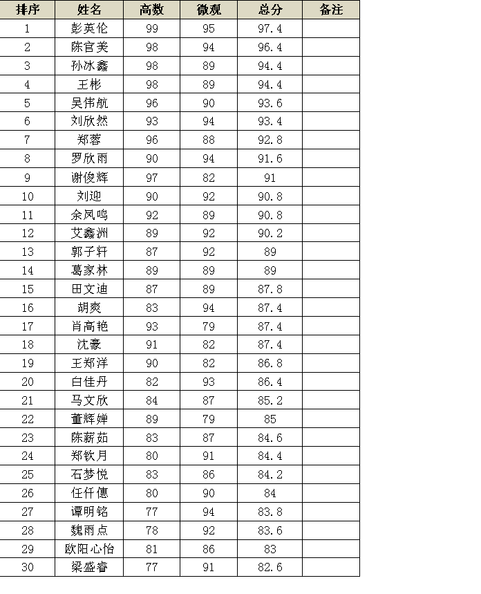 2、选拔方式:按前一个学期的核心必修课程的平均成绩(高等数学*0.6+微观经济学*0.4)进行排序。若有挂科重修的科目,按第一次考试的成绩计算。若有某学生由于转专业或是缓考等情况导致该课程无成绩时,该课程计0分。