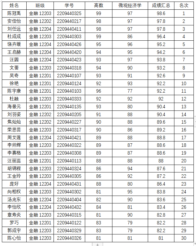 2、选拔方式:按前一个学期的核心必修课程的平均成绩(高等数学*0.8+微观经济学*0.2)进行排序。若有挂科重修的科目,按第一次考试的成绩计算。若有某学生由于转专业或是缓考等情况导致该课程无成绩时,该课程计0分。