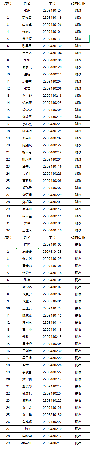 按照专业分流方案,2022级财政学类专业分为财政学和税收学两个方向,经学生自愿报名,张烁等32人进入财政学方向,陈锋等29人进入税收学方向,详细名单如下: