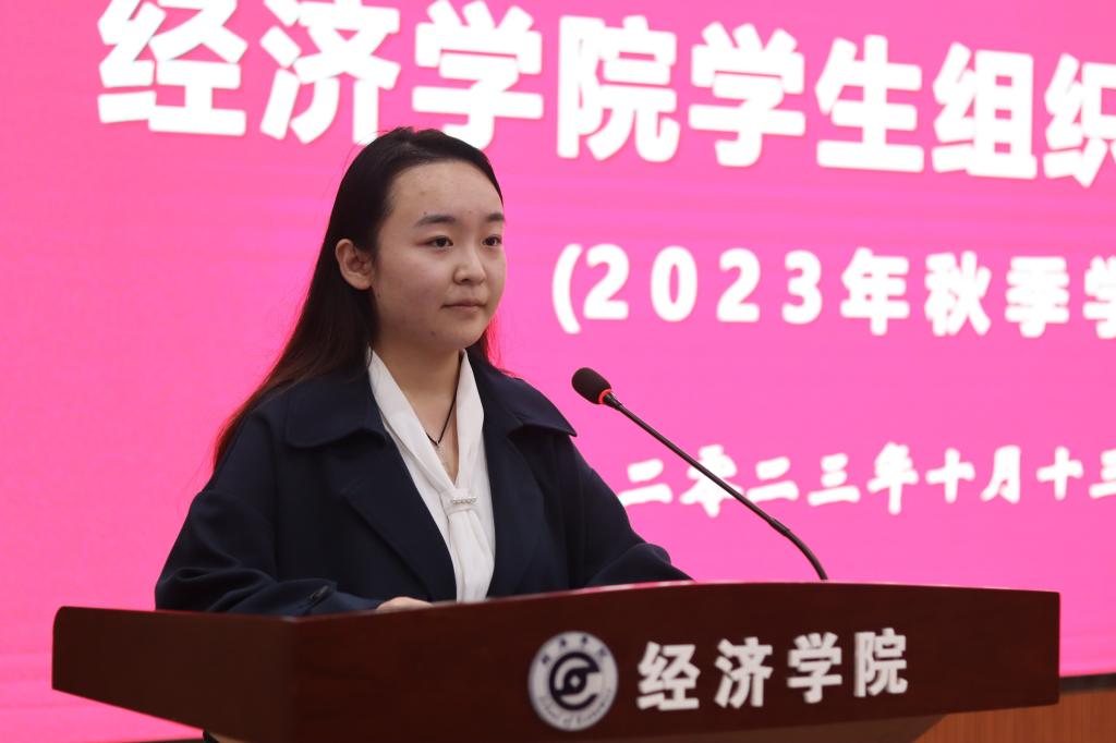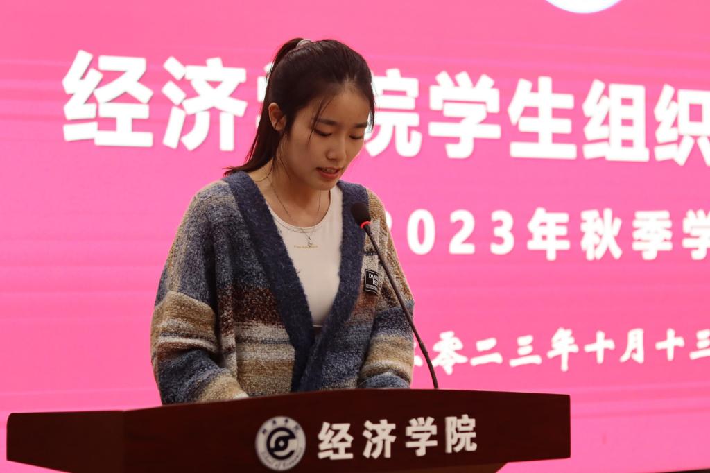 会议伊始,李一鸣向大家详细介绍了第十三届学生会主席团成员。学生会执行主席曾诗玥发表演讲。曾诗玥向学生会新成员的加入表示欢迎,对上一届分团委领导和学生的帮助与关怀表示感激,同时对未来学生会的工作提出了期望:一是加强学风建设,提升整体素质,建立高效的工作机制;二是活动多样化,满足学生需求,激发学生的热情与活力;三是加强与学院的沟通与合作,促进内外协调发展。曾诗玥向大家分享了自己在学生会工作以来的成长感悟。随后各部门上台进行工作汇报,向全体学生介绍了近期工作内容,反馈了其中存在的问题,对未来工作进行了展望。